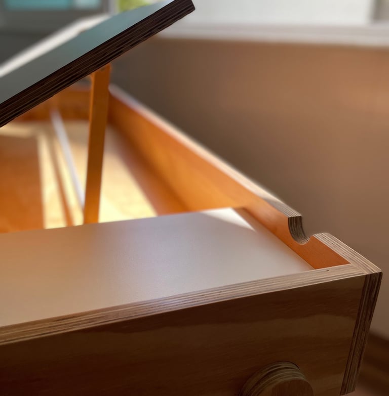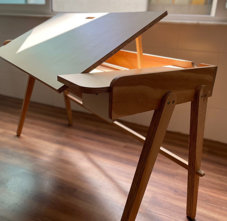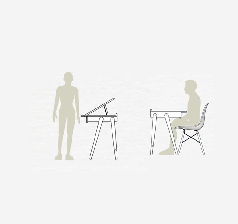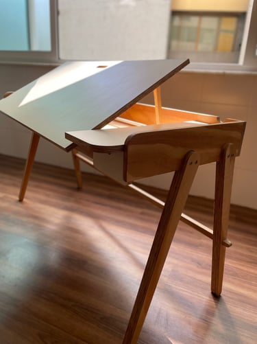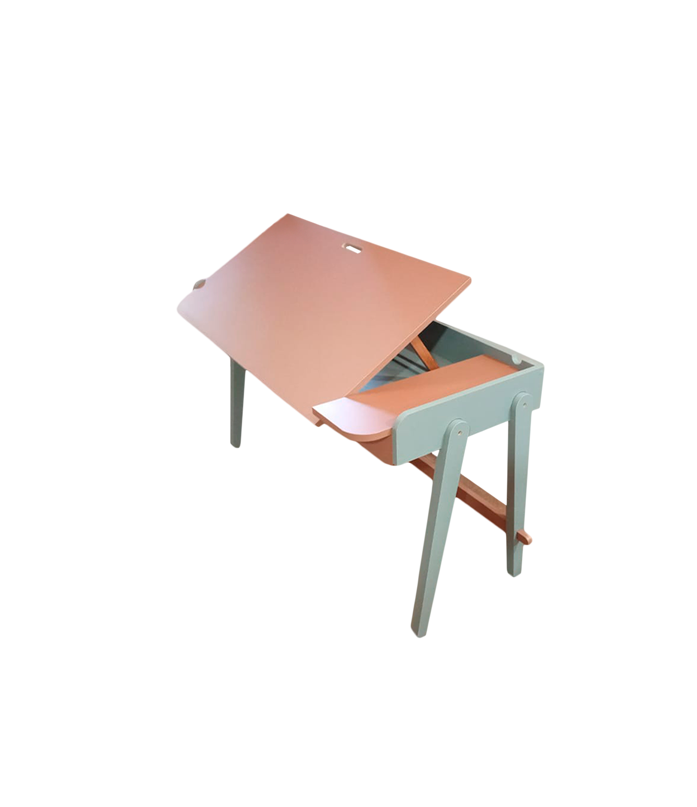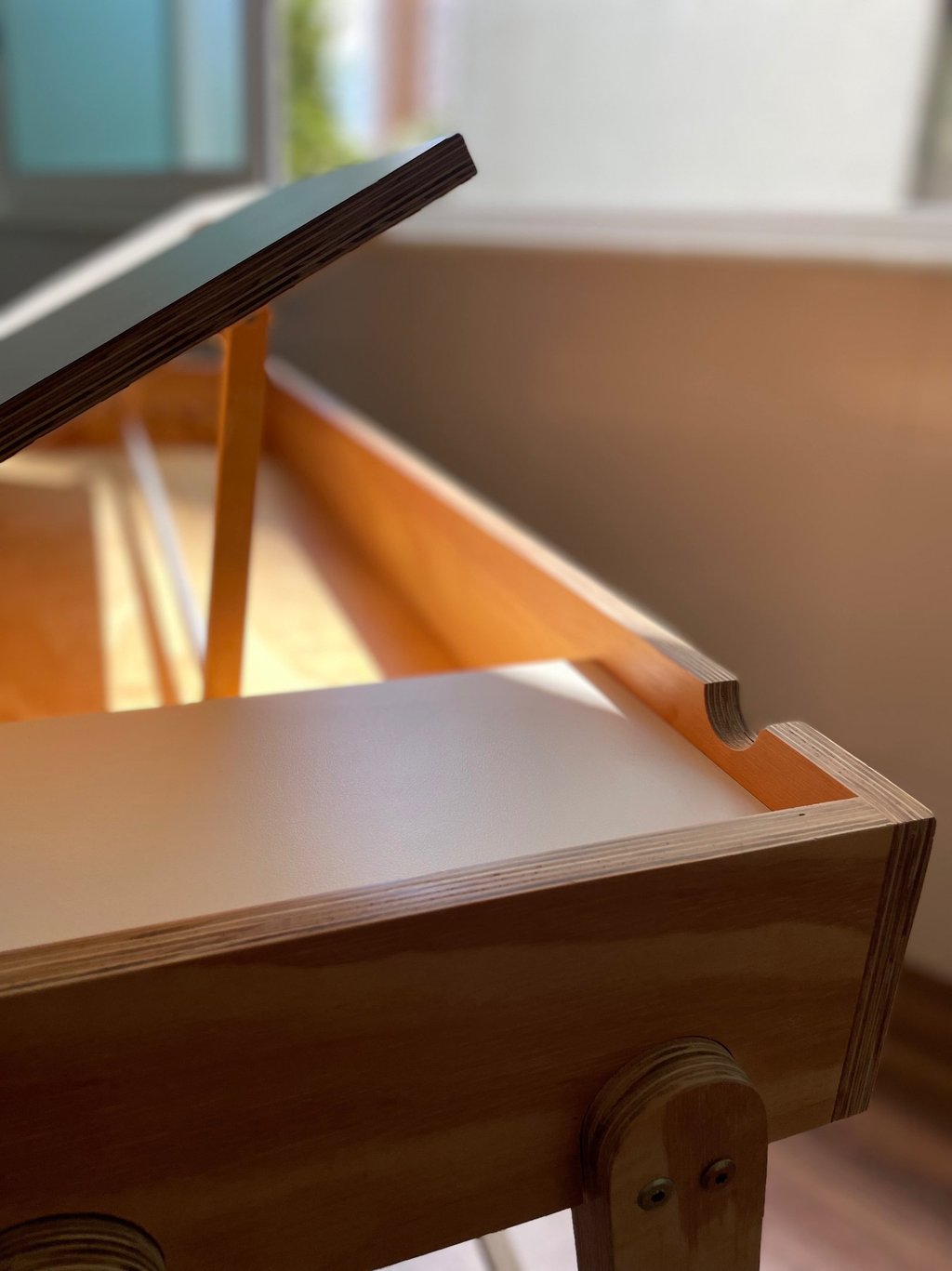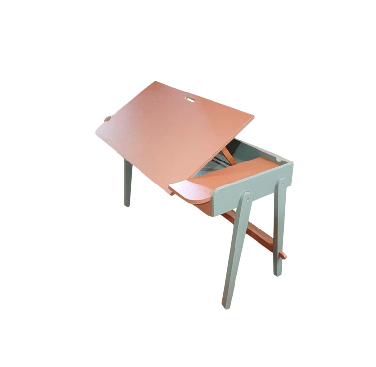 A Escrivaninha INK foi Inspirada nas cenas de pin- tores eternizados no imaginário de todos aqueles que amam arte. Os pés remetem aos pincéis, o tampo basculante permite elevação da superfície de trabalho dando liberdade de movimento e possibilitando a mudança de posturas, com ergonomia.
